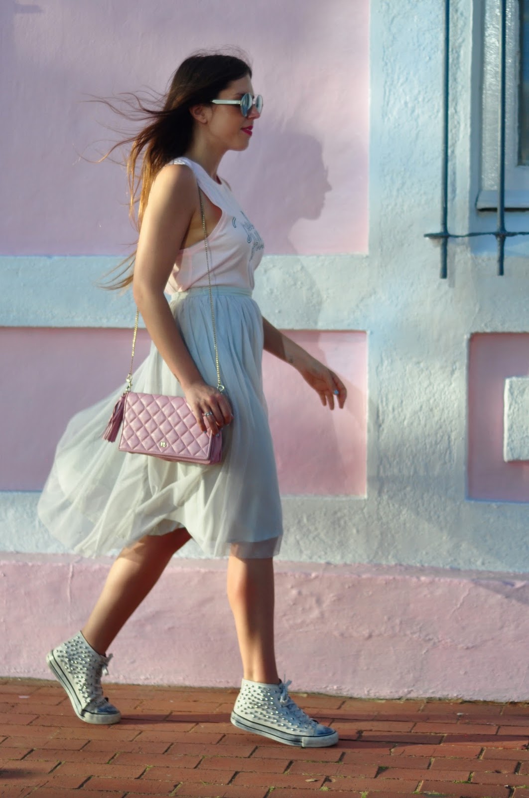 La camiseta la había comprado en Los Ángeles y aún no la había estrenado, también fue la ocasión idónea. Un look muy fresco, de tonalidades claritas, ideal para el verano.